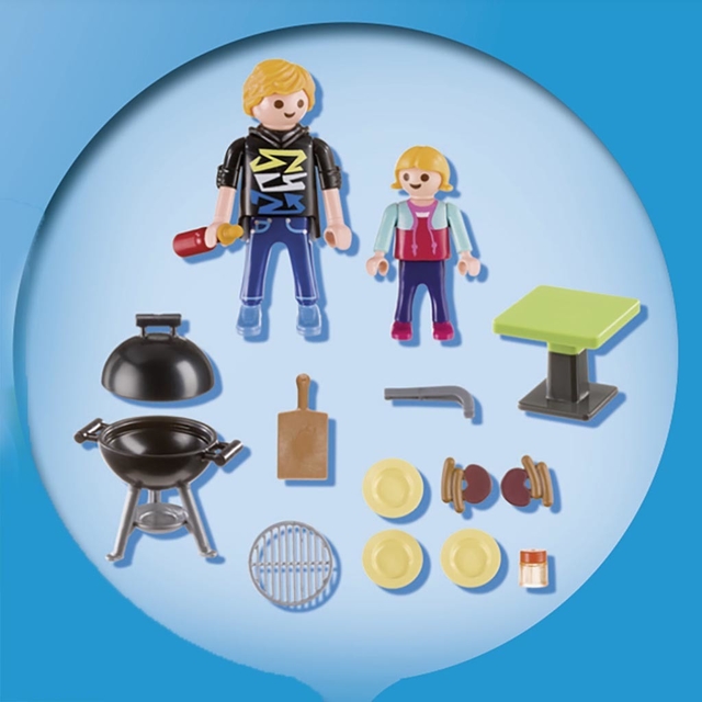 Incluye una figura de adulto, una niña, el asador, una mesa, platos, cubiertos y accesorios adicionales.