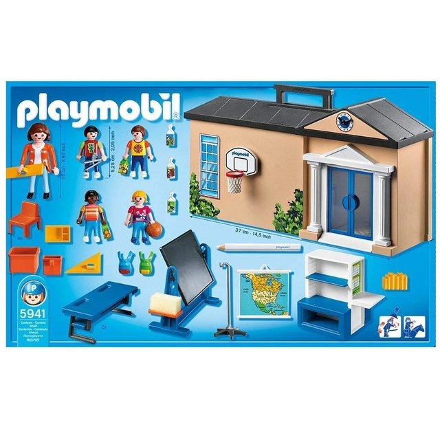 Set de juego Maletín Escuela Facil para transportar y todo listo para jugar! Contiene: 1 escuela, 5 figuras,1 silla,1 escritorio,1 pizarron,1 mapa y varios accesorios.