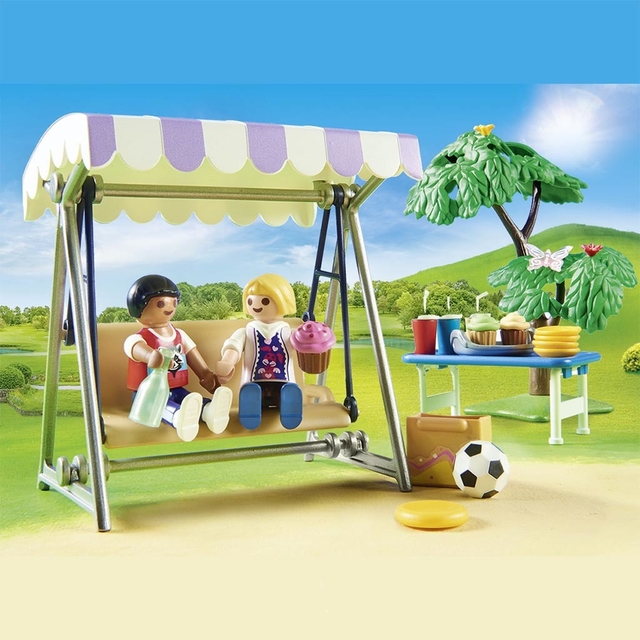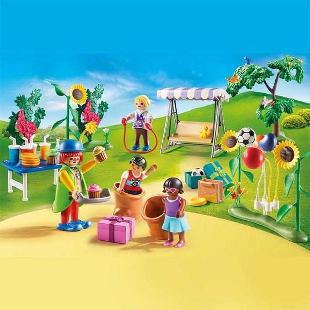 También hay invitados, esto será muy divertido. El juego consta de tres figuras de niños de Playmobil y una figura de payaso, regalos, globos, un columpio doble, una mesa plegable con vasos y magdalenas y muchos otros accesorios para fiestas.