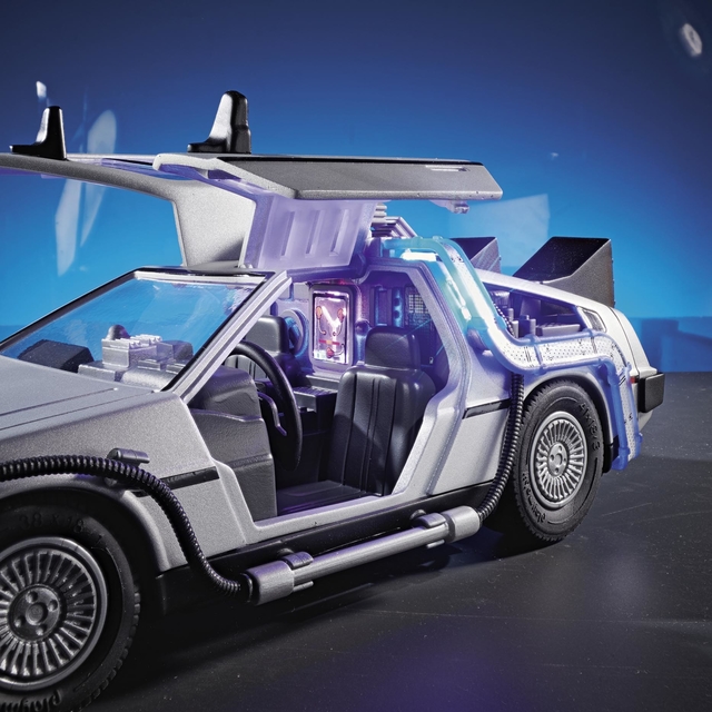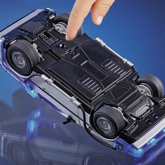 El juego incluye al DeLorean, Marty McFly, el Dr. Emmett Brown, el perro Einstein, patineta, condensador de flujo, núcleos de plutonio y estuche, y muchos otros accesorios en un total de 64 pcs.