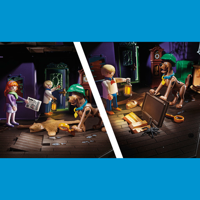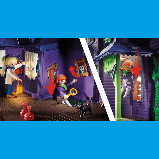 Scooby-Doo ™, Fred ™ y Daphne ™ están investigando los secretos que se encuentran dentro de la mansión misteriosa. Les esperan espeluznantes sorpresas en rincones oscuros y pasillos chirriantes, y nada debe pasarse por alto. ¡Ten cuidado! Una trampilla, un candelabro colgante, escondites secretos, puertas ocultas y una escalera de caracol mantendrán a la pandilla en alerta. El ataúd iluminado ilumina las cartas fantasma, dando pistas a la tripulación y acercándolas a capturar al villano. ¡Eeek! El ataúd también viene con efectos de sonido espeluznantes y encantados para agregar a la atmósfera inquietante. Los rostros cambiantes del vampiro pueden ser impactantes, pero una vez que la tripulación lo desenmascara, ¡el misterio finalmente se revela!