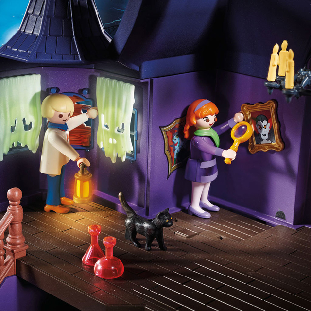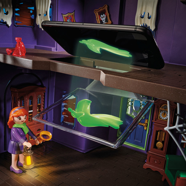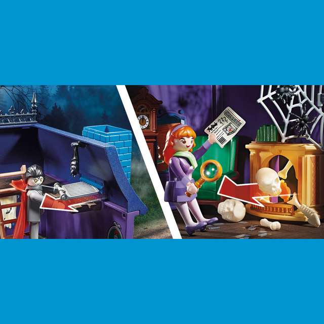 El Playset incluye Fred ™, Daphne ™, Scooby-Doo ™, vampiro, mansión encantada, ataúd con proyector y efectos de sonido, tres cartas fantasma y muchos más accesorios para una aventura emocionante.