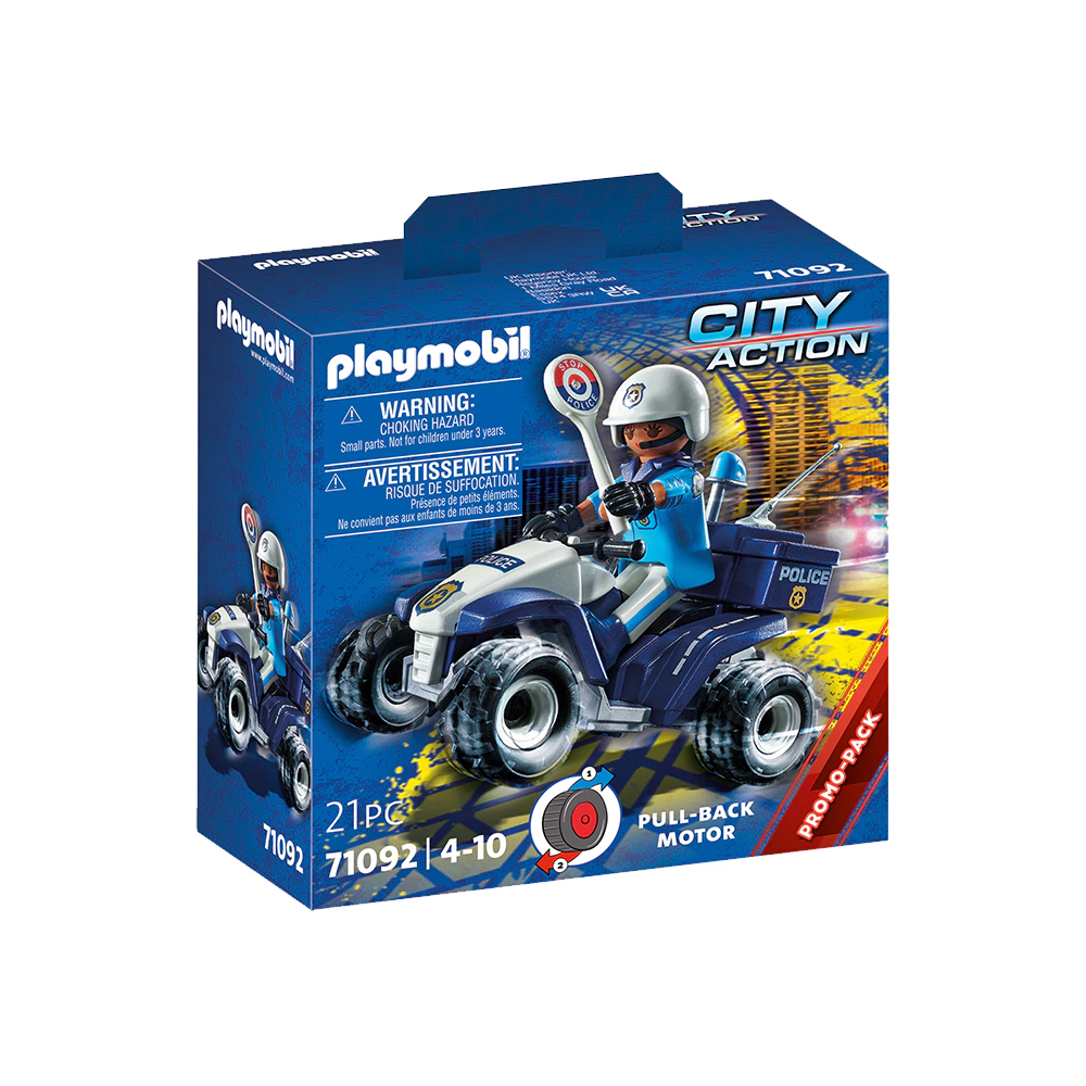 El set incluye una mujer policía PLAYMOBIL, un quad con motor retráctil, una señal de policía, un casco, guantes y otro equipo.