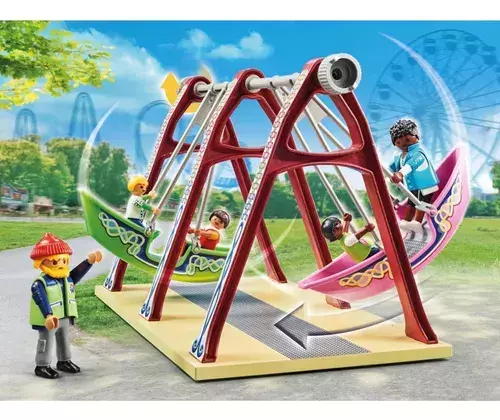 ¡Una visita al parque de atracciones! Las sillas voladoras invitan a un emocionante paseo, ¡donde incluso una vuelta completa es posible! ¿Quién se atreve a subir? Los visitantes pueden poner a prueba sus habilidades de puntería en el juego de tiro a latas y luego reponer fuerzas con un aperitivo en el acogedor quiosco. Con muchas funciones y gran cantidad de accesorios.