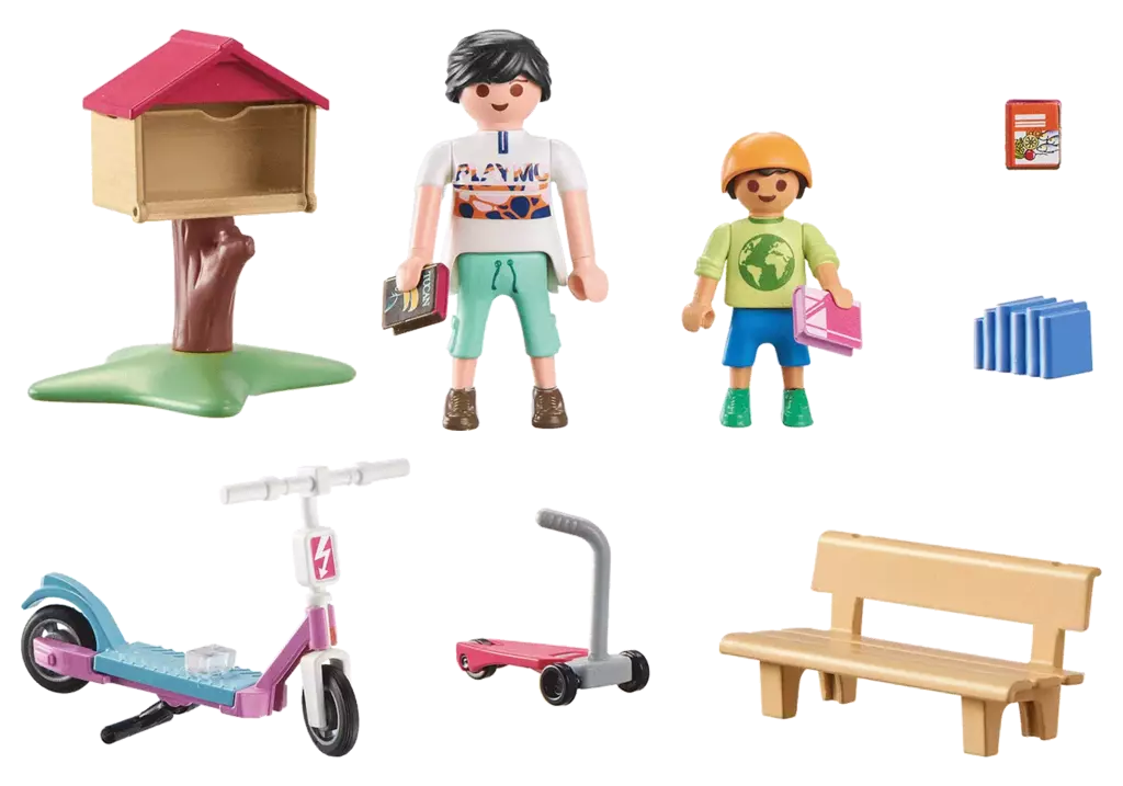 El intercambio de libros de PLAYMOBIL es ideal para los amantes de los libros. En el armario de intercambio de libros, siempre hay nuevas y emocionantes historias por descubrir. Madre e hijo dan un pequeño paseo en sus scooters y se toman un descanso en la biblioteca para elegir una nueva lectura. El niño devuelve el libro ya terminado en la casa. El mundo de juego del Tiny House de PLAYMOBIL invita a niñas y niños a participar de manera lúdica en los temas de sostenibilidad y protección del medio ambiente.