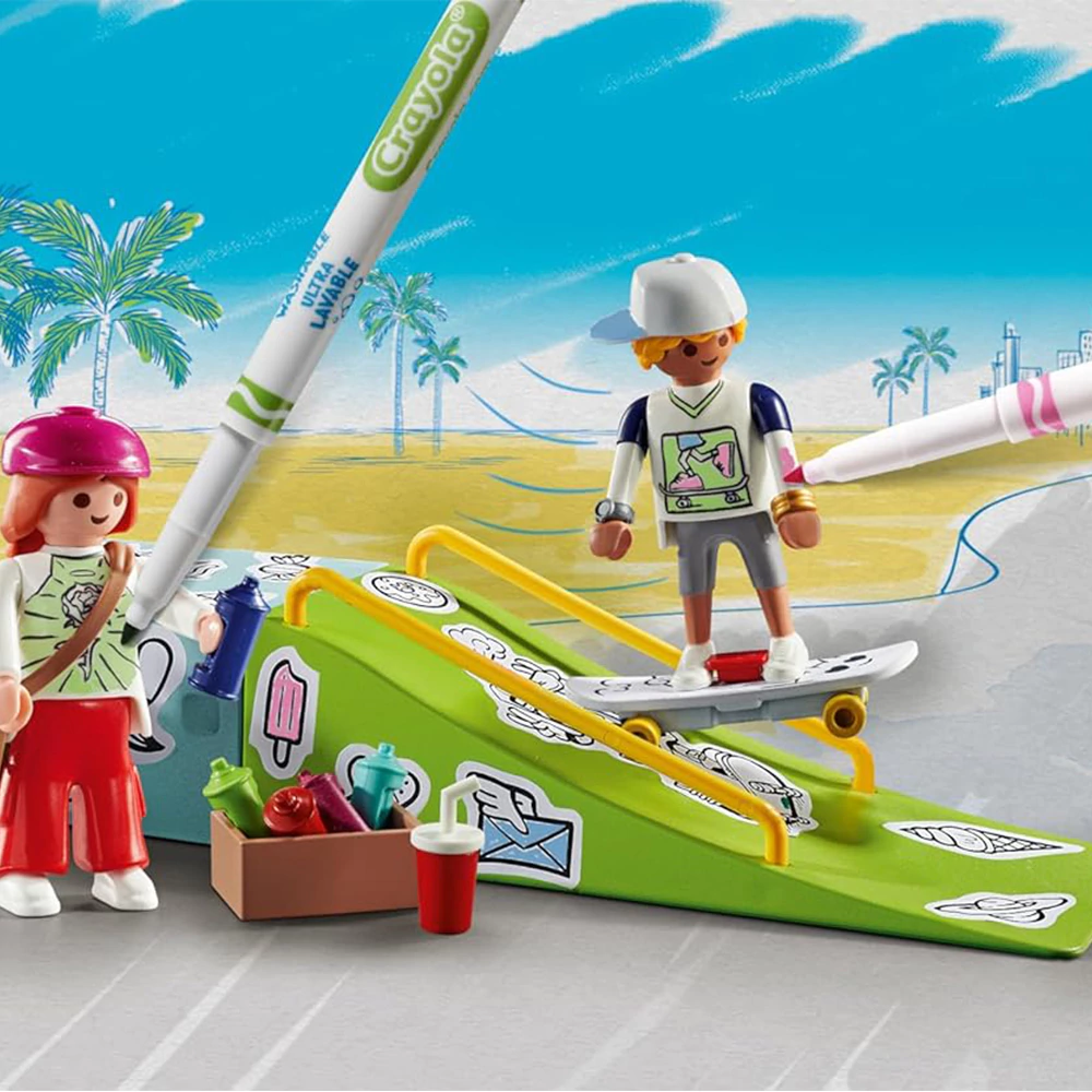 Colorea y crea diseños únicos en el Skatepark de PLAYMOBIL Color con pinturas lavables. Este set combina la acción del skate con la creatividad del arte urbano, permitiendo a niños y niñas decorar las paredes, la rampa y las superficies una y otra vez. Incluye figuras, monopatín, rampa con plataforma y pared, palmera, radiocasete y sprays para pintar. La pinza del monopatín es ajustable para diferentes figuras y la esponja facilita correcciones.