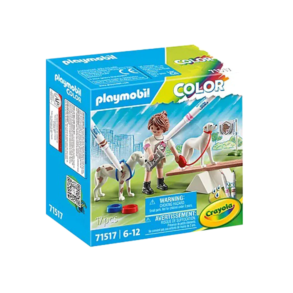 Disfruta horas de juego con el set Playmobil Adiestramiento de Perros 71517. Incluye una figura mujer entrenadora, dos perros (dálmata y gran danés) y accesorios: rampa/balancín obstáculo, placa base con bandera, 2 comederos, 2 correas, 2 rotuladores Crayola, esponja y hoja de pegatinas para pintar y lavar.