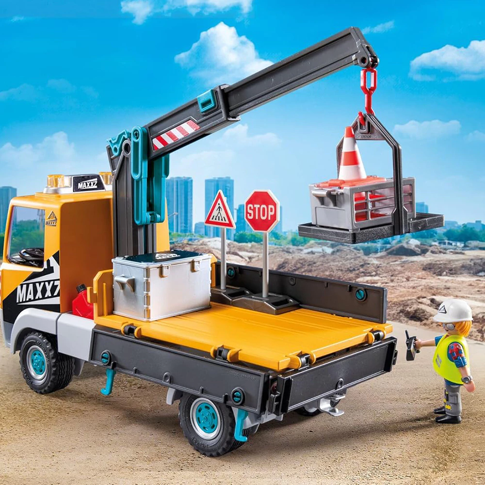 El Camión de Construcción con Grúa de PLAYMOBIL es la herramienta ideal para maniobrar objetos pesados en cualquier obra. Su brazo telescópico gira y se extiende, facilitando el traslado de cargas voluminosas con precisión. La zona de carga cuenta con laterales abatibles e inclinables para una descarga sencilla y rápida. Además, el techo desmontable ofrece acceso al interior con espacio para dos figuras, permitiendo trabajar en equipo y planificar cada tarea.