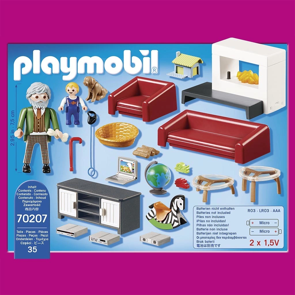 El juego incluye dos figuras de Playmobil, un cachorro de perro con cestas y huesos para perros, sofá cama, sillón para dormir, aparador, caballito y muchos otros muebles.