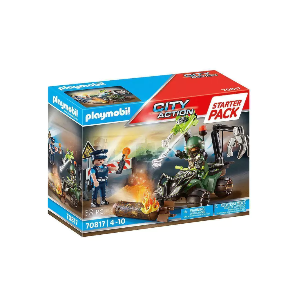 ¡La introducción perfecta a los mundos PLAYMOBIL! El ágil brazo de agarre del quad puede ayudar al experto a desactivar la bomba mientras el policía cierra la zona de peligro.